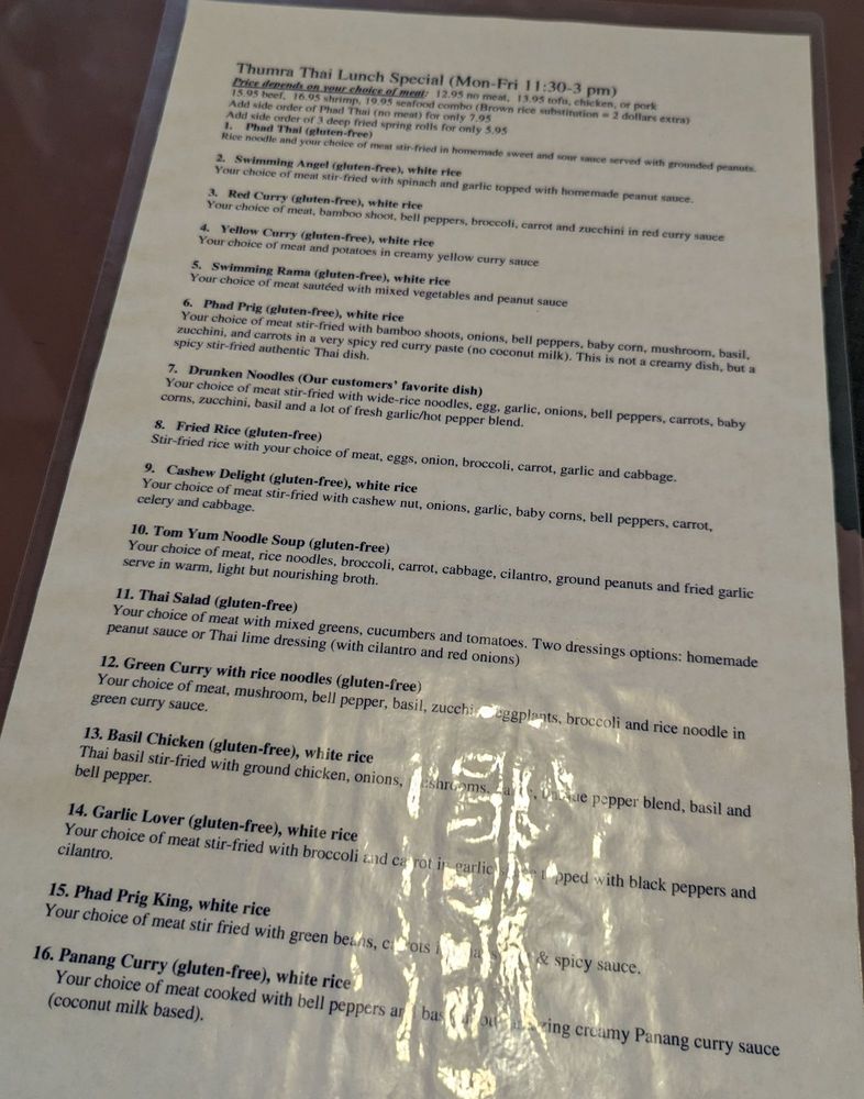 Seafood lovers will savor specialties such as the grilled salmon topped with rich red curry sauce and the tender halibut with creamy Panang curry. What truly differentiates Thumra is its commitment to personalized dining, accommodating dietary requests without sacrificing taste. With glowing reviews praising both the food and the welcoming atmosphere, Thumra Thai promises an unforgettable experience that feels like a comforting visit to a friend's home.